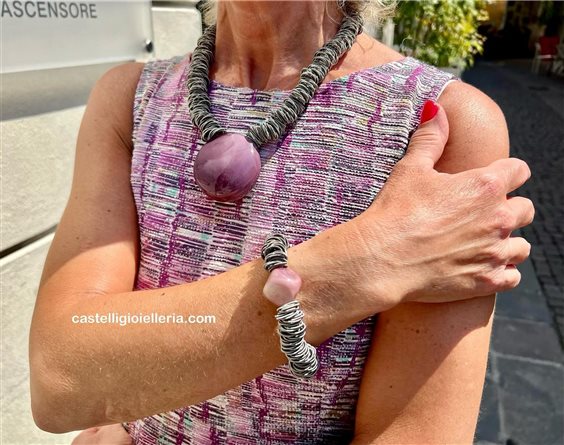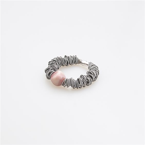 Una perla in vetro di Murano soffiato a bocca e lavorato a caldo in più colori sovrapposti, per dare vita a sfumature sempre diverse. Gli anellini del bracciale sono in molla d'acciaio totalmente anallergico. Il fermaglio, in materiale anallergico, funziona a calamita rendendolo praticissimo da indossare.