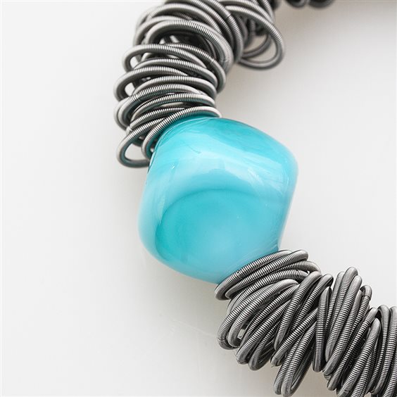 Una perla in vetro di Murano soffiato a bocca e lavorato a caldo in più colori di vetro sovrapposti, per dare vita a sfumature sempre diverse. Gli anellini del bracciale sono in molla d'acciaio totalmente anallergico. Il fermaglio, in materiale anallergico, funziona a calamita rendendolo praticissimo da indossare.