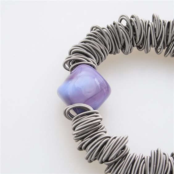 Bracciale realizzato con una perla in vetro di Murano soffiata a bocca e lavorata a caldo secondo la tecnica del vetro sommerso in modo da ottenere le sfumature di colore. Gli anellini che la avvolgono sono in molla d'acciaio totalmente anallergico. Il fermaglio, in materiale anallergico, funziona a calamita rendendolo praticissimo da indossare.