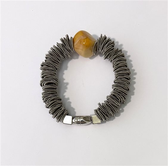Una perla color avorio in vetro di Murano soffiato a bocca e lavorato a caldo in più colori sovrapposti, per dare vita a sfumature sempre diverse. Gli anellini del bracciale sono in molla d'acciaio totalmente anallergico. Il fermaglio, in materiale anallergico, funziona a calamita rendendolo praticissimo da indossare.