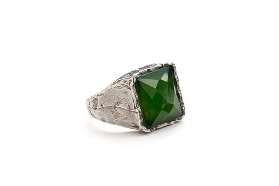 Anello in argento 925/°°° invecchiato (effetto realizzato interamente a mano) con giadeite verde. Aperto e regolabile: dalla misura 20 può essere allargato fino alla misura 26. Creazione artigianale, 100% Made in Italy.