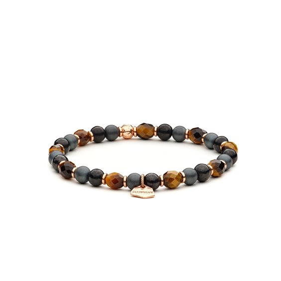 Bracciale in argento 925/°°° laminato oro rosa con agata nera, ematite e occhio di tigre marrone. Le gemme si susseguono creando un perfetto ordine cromatico, reso originale unicamente dalle sfumature naturali della pietra. Tutti i gioielli della linea Majorette sono identificati dalla sfera Antracite in argento 925/°°°. Gli elementi vengono infilati in un filo elastico in silicone molto resistente. Creazione artigianale, interamente realizzata a mano, 100% Made in Italy.