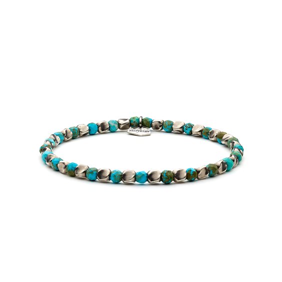 Bracciale in argento 925/°°° e howlite turchese. Le gemme si susseguono creando un perfetto ordine cromatico, reso originale unicamente dalle sfumature naturali della pietra. Tutti i gioielli della linea Speed sono identificati dalla targhetta Antracite in argento 925/°°°. Gli elementi vengono infilati in un filo elastico in silicone molto resistente. Creazione artigianale, interamente realizzata a mano, 100% Made in Italy.