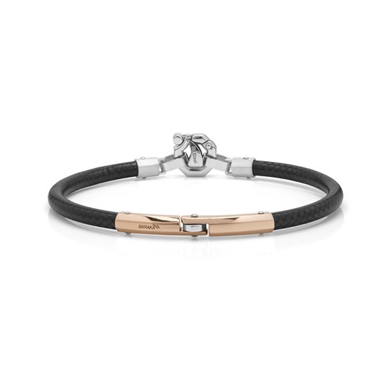 Bracciale in fibra di carbonio e oro rosa, finali e chiusura in acciaio impreziosita da un diamante, creato artigianalmente con le più moderne tecnologie.