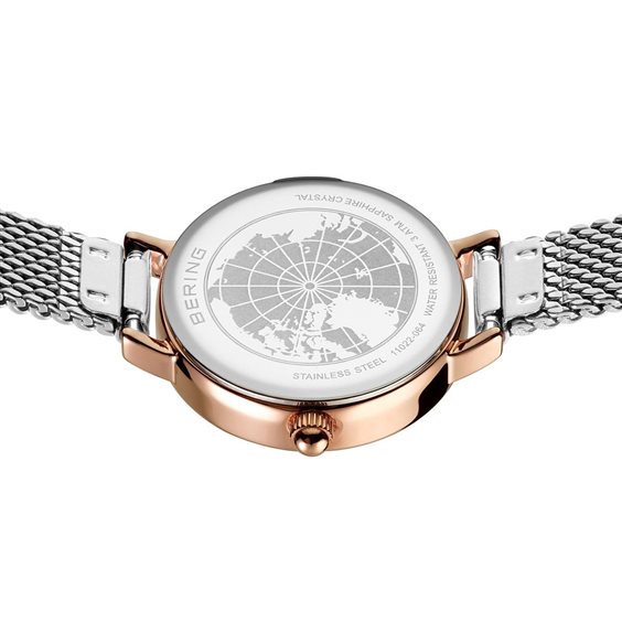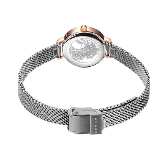Ispirata al design danese, la COLLEZIONE CLASSIC presenta un orologio unico, creato per dare un tocco di stile al look quotidiano. La cassa in acciaio inox chirurgico (316L) con finitura oro rosa, insieme al moderno cinturino in maglia Milano in tinta col quadrante, realizzano il classico look BERING. Il quadrante silver, impreziosito da indici laminati, è protetto da un vetro zaffiro antigraffio. Garanzia tre anni.