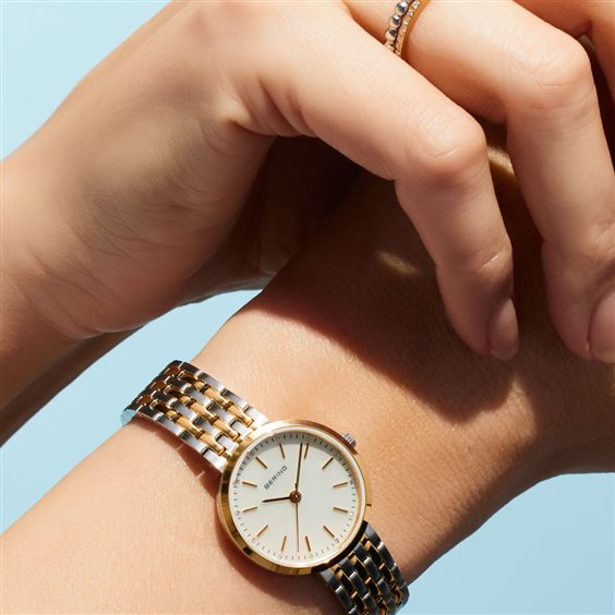Ispirata al design danese, la COLLEZIONE CLASSIC presenta un orologio unico, creato per dare un tocco di stile al look quotidiano. La cassa in acciaio inox chirurgico (316L) con finiture bicolor, insieme al cinturino maglia panthère, realizzano il classico look BERING. Il quadrante in madreperla iridescente, impreziosito da indici lucidi, è protetto da un vetro zaffiro antigraffio. Garanzia tre anni.