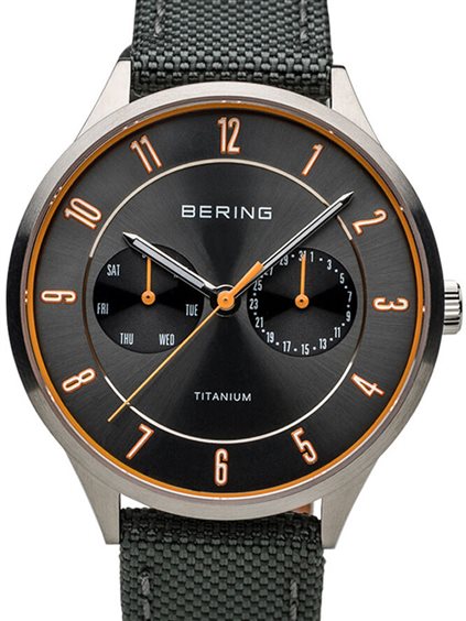 Ispirata al design danese, la COLLEZIONE TITANIUM presenta un orologio unico, creato per dare un tocco di stile al look quotidiano. La cassa in titanio di alta qualità (materiale robusto, ultraleggero e ipoallergenico), la finitura spazzolata, insieme al moderno cinturino in pelle e tessuto, realizzano il classico look BERING. Il quadrante color antracite con dettagli arancioni è protetto da un vetro zaffiro antigraffio. Garanzia 3 anni.