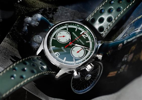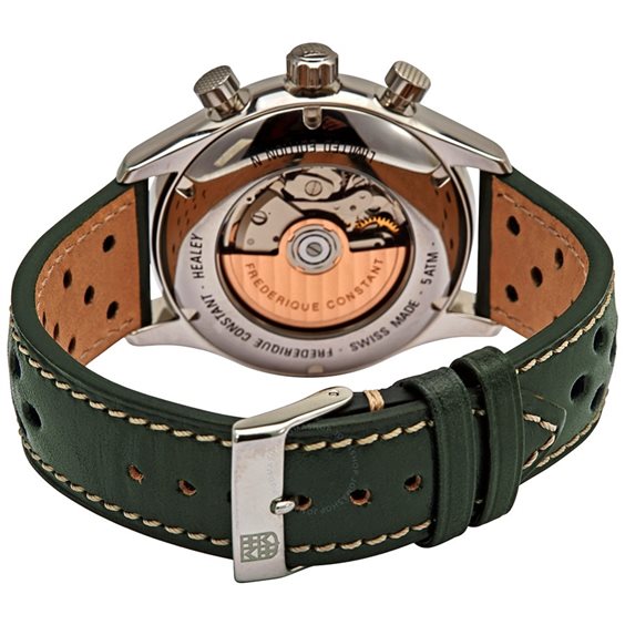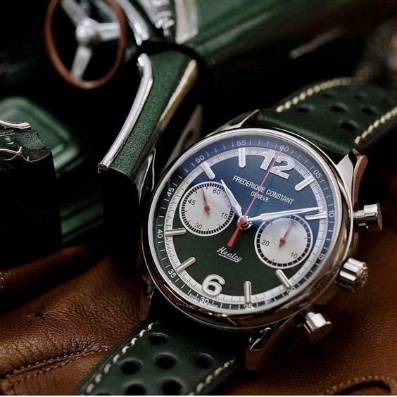 L’eleganza senza tempo di Vintage Rally Healey Chronograph: cassa mm.42 in acciaio inox, cinturino in cuoio verde con fibbia a ardiglione, vetro zaffiro convesso e antigraffio, quadrante con indici e numeri arabi, impermeabilità 5 atm., fondello vitré, movimento automatico svizzero con cronografo calibro FC-397 (28.800 alt/h, riserva di carica 46 ore).