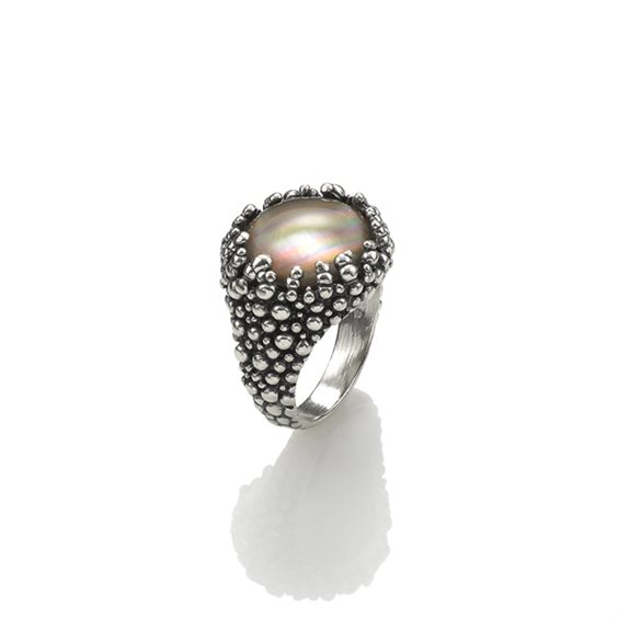 Anello Maui. La sapiente scelta dei materiali e l'abilità dei nostri artigiani rendono unico l'Anello Maui, caratterizzato da un perfetto connubio tra madreperla e argento brunito. I riflessi cangianti della gemma raccontano il fascino di un'alba riflessa sull'oceano, per una donna romantica e raffinata. Fatto a mano in azienda.