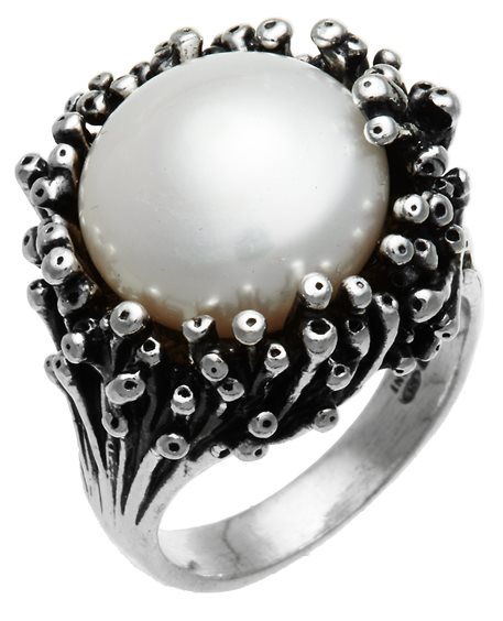Anello Anemone. Tutta la bellezza primordiale dell'oceano profondo caratterizza l'Anello Anemone, dal design ispirato queste creature dalle profondità marine, e che esprime forza ed eleganza. Una perla naturale risplende al centro dell'anemone ricreato con minuziosi tentacoli d'argento brunito, il cui effetto chiaroscurale mette in risalto ogni piccolo dettaglio