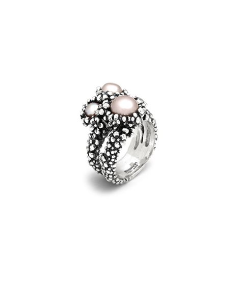 Il prezioso motivo floreale in argento fuso a cera persa e poi brunito, illuminato dalla diamantatura eseguita a mano, incastona 3 diverse perle d'acqua dolce dalla delicata nuance rosa. Un anello elegante e raffinato, realizzato interamente a mano in azienda.