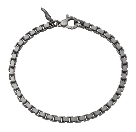 Bracciale Maglia Quadra Black. Una catena a maglia quadra, essenziale e geometrica, diventa un bracciale in argento dal design forte ed elegante, impreziosito da una finitura in rodio nero. Tale lavorazione conferisce all'argento 925 una lucentezza profonda e intensa, con effetto nero metallico di estrema contemporaneità.