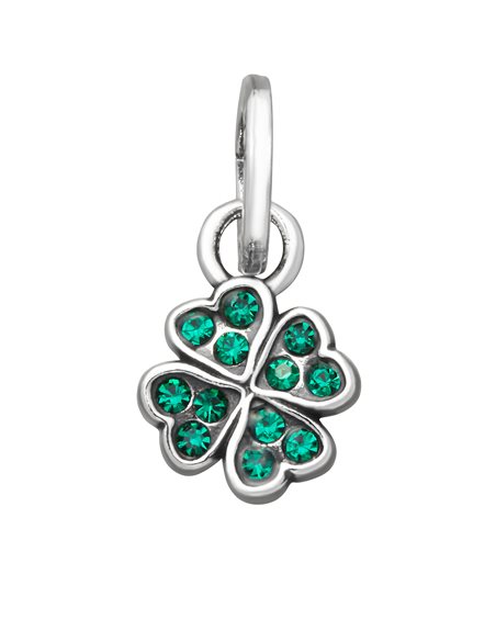 Mini Charm Quadrifoglio Crystal Verde, realizzato completamente a mano in azienda. Porta sempre con te un simbolo di fortuna grazie a questo mini charm in argento a forma di quadrifoglio. La sua straordinaria luminosità è accentuata dai micro-zirconi verdi montati a pavé, per un effetto scintillante. Altezza cm.1,20 (esclusa maglina con logo cm.0,80).