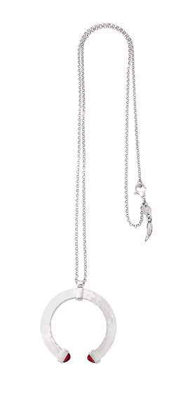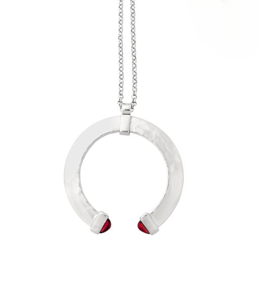 Pendente Red Blade. Questo pendente, munito di catena in argento di cm.80, si distingue per un elegante gioco di volumi e riflessi, arricchito da un'energia cromatica unica. I cristalli rossi, luminosi e raffinati, impreziosiscono l'argento con un tocco di intensa lucentezza. Realizzato a mano in azienda.