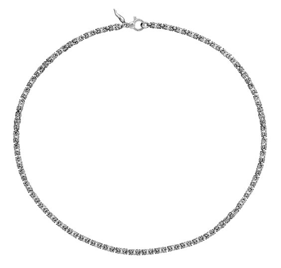 Collana Bizantina Mini Mini. Da sempre best seller del brand, diventa preziosa collana in argento una catena che ha fatto la storia della gioielleria. E' la maglia bizantina in versione mini mini, lavorata artigianalmente, col suo particolarissimo ed elegante intreccio. Un gioiello estremamente versatile che si presta ad un indosso sia maschile che femminile.