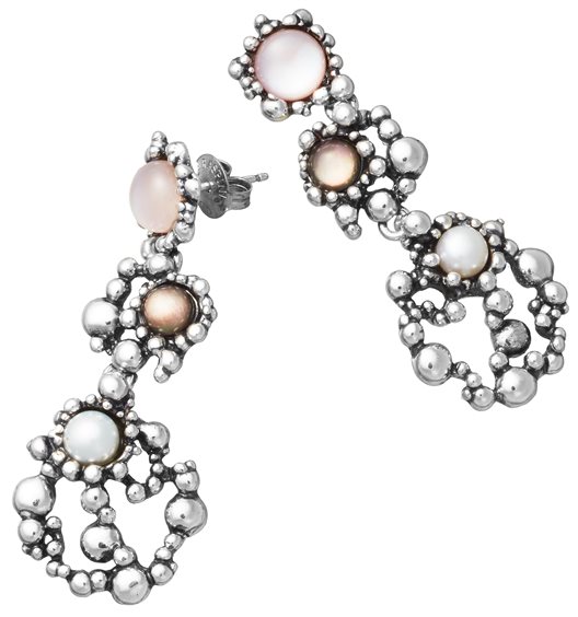 Orecchini Sunrise. L’argento brunito incontra il colore cangiante dell’alba, in un gioiello che evoca quell’atmosfera sospesa fatta di luce e tempo. La vita vera ha bisogno di sogni preziosi. Argento 925/°°°, perle naturali, madreperla rosa e verde doppiate con quarzo.