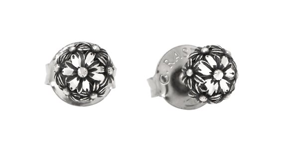 Orecchini Margherite Shine Mini. Delicati orecchini a bottone creati con due bulle ricoperte di bellissime piccole margherite in argento. Ogni singolo petalo dei fiori, realizzati a cera persa e quindi bruniti, è diamantato a mano per regalare ancora più luce al gioiello.