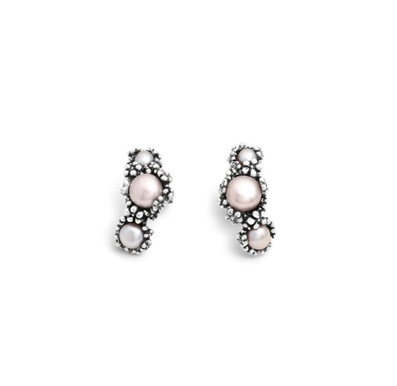 Orecchini dal fascino raffinato e senza tempo. Il motivo floreale in argento brunito, realizzato con l'antica tecnica della fusione a cera persa e illuminato dalla diamantatura artigianale, incastona sei perle d’acqua dolce rosa in tre dimensioni. Realizzati interamente a mano in azienda.