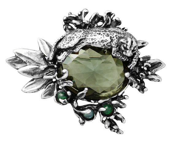 Spilla Amazzonia. Una bellissima spilla animalier in argento brunito con quattro pietre colorate: un grande ovale di quarzo idrotermale e tre siamiti tutte giocate sulle nuances del verde. Il gioiello è realizzato completamente a mano in azienda. Dimensioni: cm. 4,5 x 5,5.