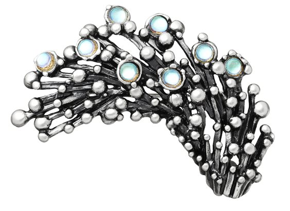 Spilla Fireworks. Nata dall'ispirazione di Perlage, la spilla Firewoks è abbellita da alcuni "Mystic Cristal" dal colore cangiante. Il gioiello, fuso a cera persa in argento brunito, è realizzato completamente a mano in azienda. Dimensioni: cm.6 x 2,5.