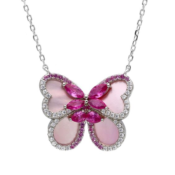 Farfalla con madreperla iridescente e zirconie multicolor. La collana monta una serie di maglie d'accorciamento.