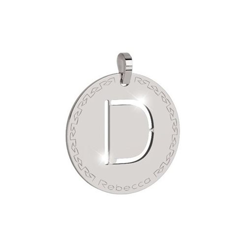 Charm in bronzo rodiato anallergico, al cui centro è presente una lettera incorniciata circolarmente da un motivo a greca con il logo Rebecca.
