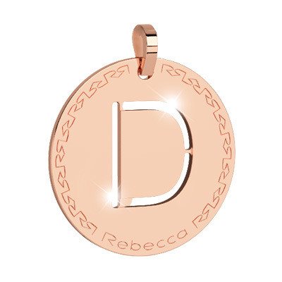 Charm in bronzo anallergico laminato oro rosa, al cui centro è presente una lettera incorniciata circolarmente da un motivo a greca con il logo Rebecca.