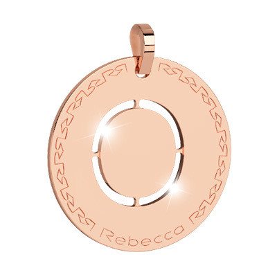 Charm in bronzo anallergico laminato oro rosa, al cui centro è presente una lettera incorniciata circolarmente da un motivo a greca con il logo Rebecca.