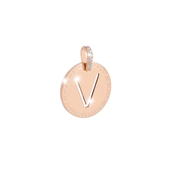 Charm in bronzo anallergico laminato oro rosa, al cui centro è presente una lettera incorniciata circolarmente da un motivo a greca con il logo Rebecca ed anellino con zirconie bianche. La collana per questo charm è inclusa nel prezzo: acquista la tua lettera e la riceverai in regalo.