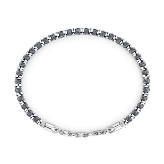 Il bracciale alterna sfere lucide ad altre zigrinate di tonalità nera; la maglia morbida permette al bracciale di adattarsi perfettamente al polso. Un gioiello dal design ricercato, adatto per qualsiasi occasione. La chiusura a moschettone consente la regolazione da cm.19 a cm.21.