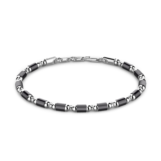 Bracciale morbido con sferette in argento lucido ed elementi tubolari neri rodiati. Uno stile esclusivo in cui identificarsi, un carattere particolare in cui riconoscersi. Design curato in ogni dettaglio, per trasmettere la propria personalità. Per affermare la propria identità.