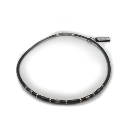 Collana con dischetti e cilindretti in acciaio 316L ipoallergenico lucido, laminato oro rosa e nero rodiato. Misura regolabile da cm.50 a cm.48. Uno stile esclusivo in cui identificarsi, un carattere particolare in cui riconoscersi. Design curato in ogni dettaglio, per trasmettere la propria personalità. Per affermare la propria identità.