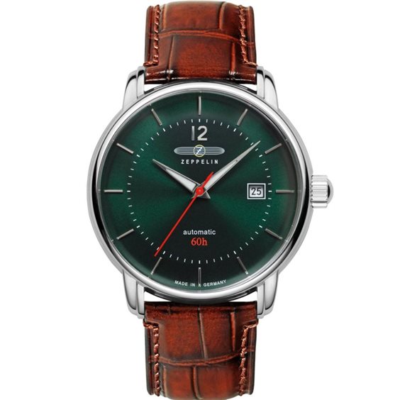Modello Bodensee con movimento automatico giapponese Miyota cal.8315 (con riserva di carica di 60 ore), cassa in acciaio inox, vetro minerale K1, quadrante verde con datario, fondello vitré, cinturino in pelle cucito a mano con fibbia a ardiglione.